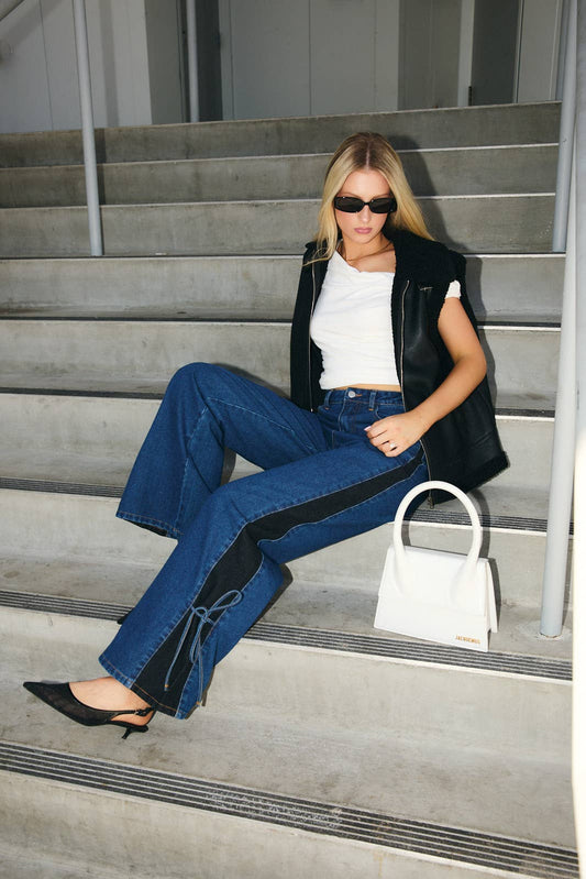SIDE CONTRAST & BOW DETAIL WIDE PANTS: DENIM-BLACK