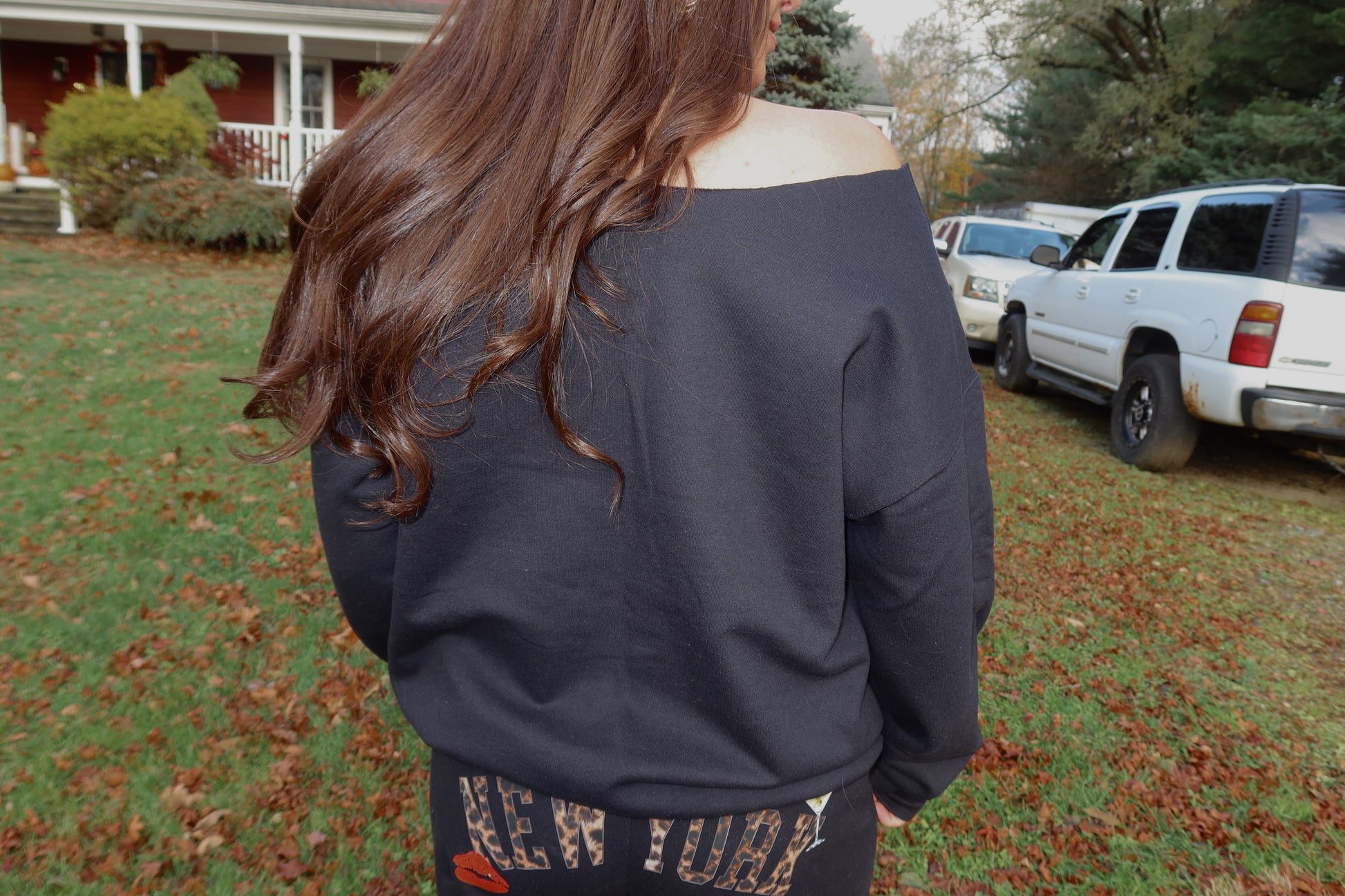This off the shoulder New York Leopard Sweatshirt is perfect for the fashion-forward woman. Made with matching pants (sold separately), stay comfy and cute while making a statement. Featuring a fierce leopard print, this sweatshirt is a must-have for any wardrobe.
