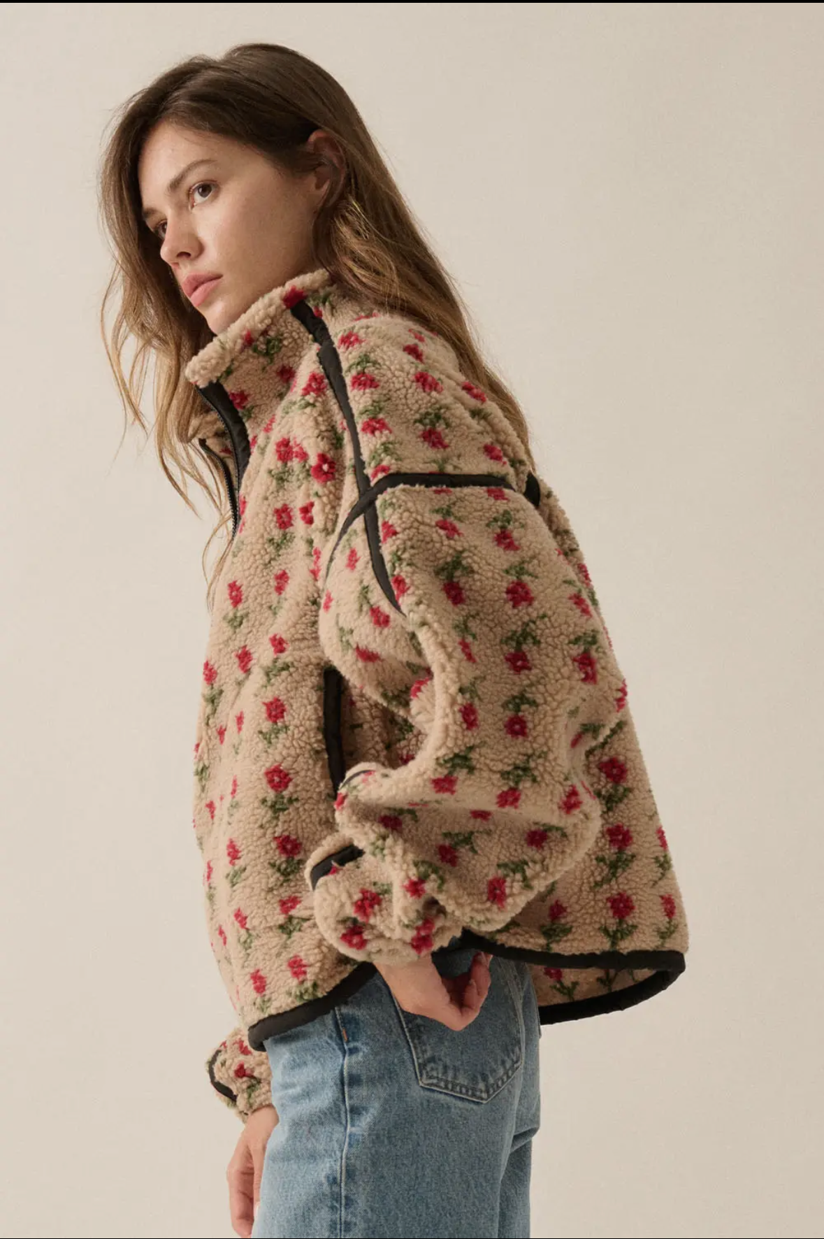A cozy floral-print fleece pullover jacket featuring: