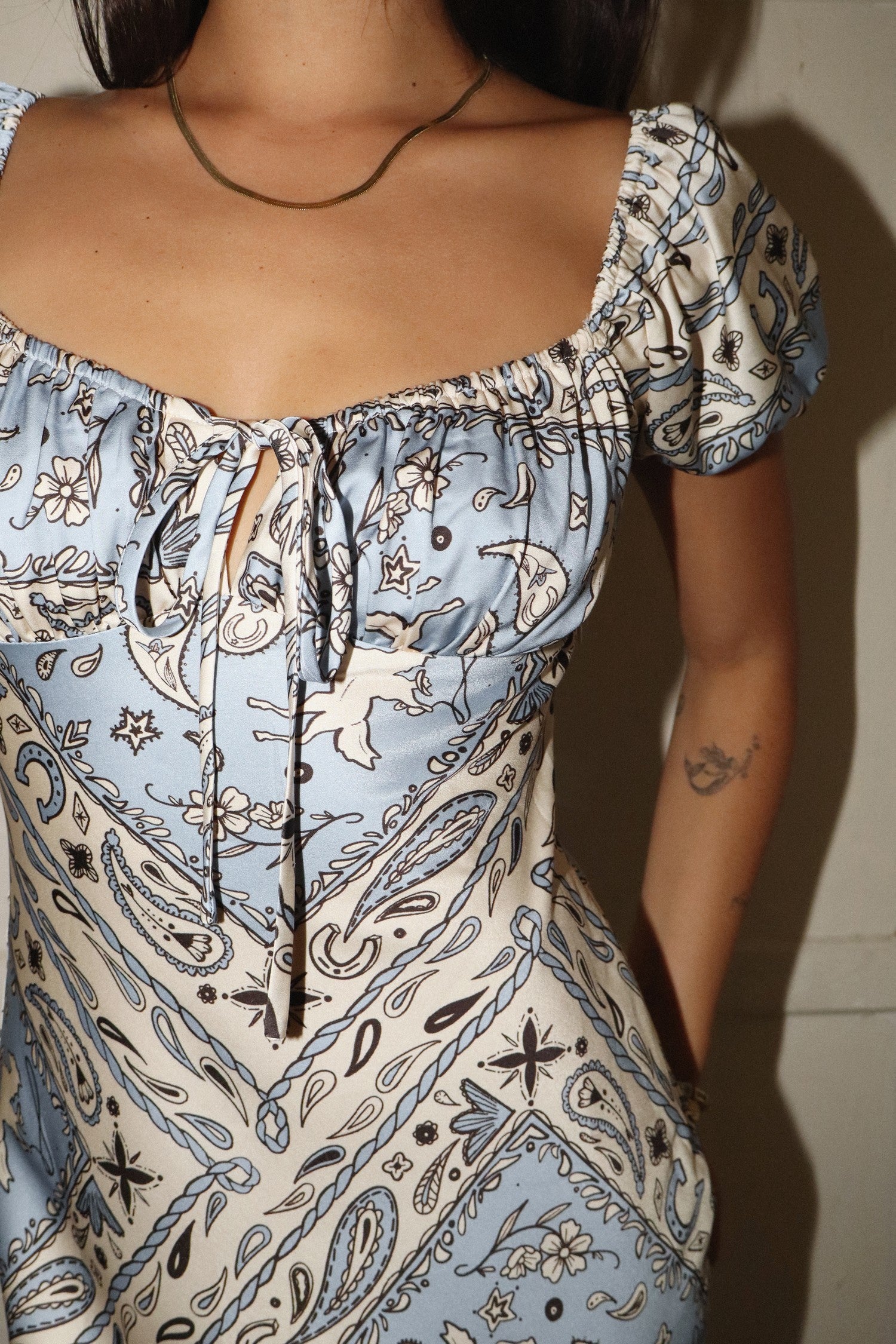 Elevate your style with this Sky Blue Western Bandana Midi Dress, featuring a smooth silky fabric that feels as good as it looks. The delicate white and sky blue color palette is brought to life with a distinctive western bandana print, blending classic charm with modern elegance. Perfect for casual outings or special events, this dress offers a flattering midi length that moves gracefully with you while keeping your look effortlessly chic. Make a statement with every step in this uniquely stylish and comfortable dress.