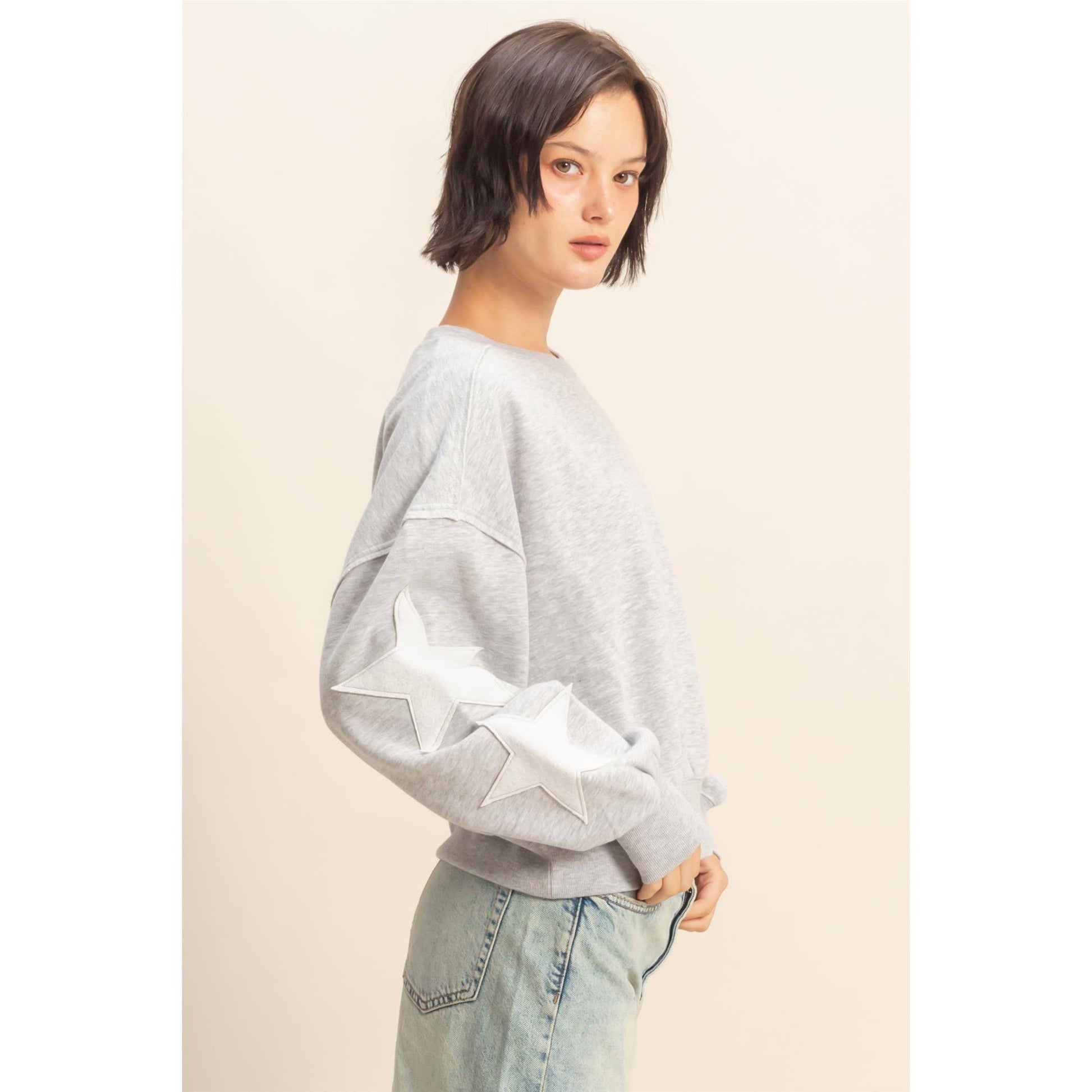 Elevate your casual wardrobe with this unique crewneck sweatshirt, adorned with star patch on the sleeves for a touch of whimsy. The relaxed fit offers unmatched comfort, making it perfect for casual outings or cozy evenings at home. Pair it with your favorite denim or layer it under a structured jacket for a fashion-forward look. Ideal for transitioning seasons, this piece blends style and practicality seamlessly. Model Is 5' 9" Tall, 32" Chest, 23" Waist, 35" Hips And Wearing A Size Small Imported. Designed In The USA