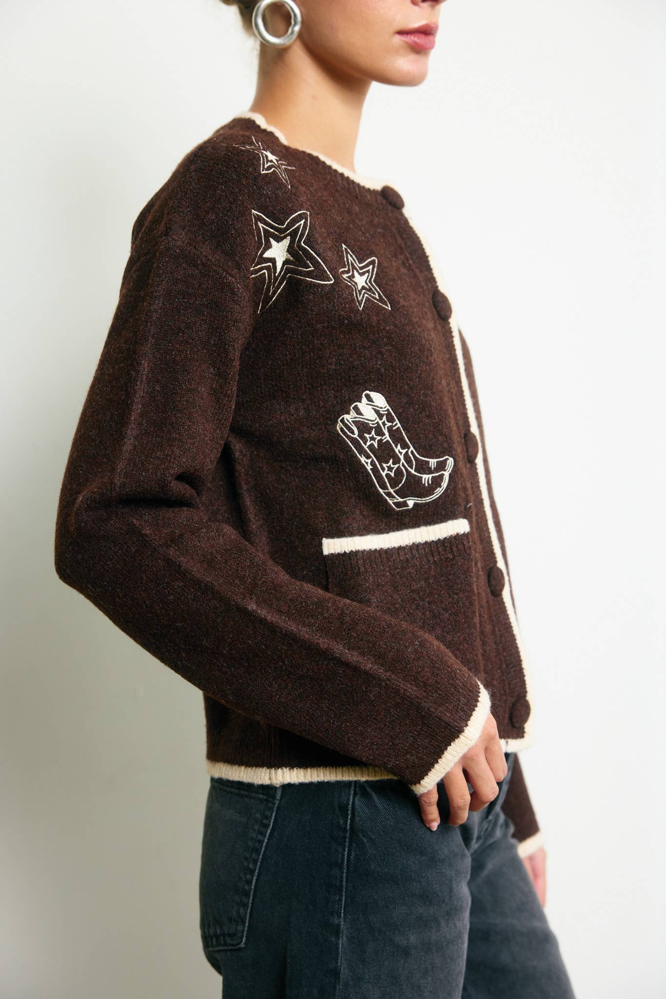 Featuring playful cactus, boot, and star motifs, this piece adds a fun and nostalgic touch to your Fall wardrobe. The contrast trim and covered buttons add a refined finish, while the soft, brushed knit keeps you warm and stylish all season long.